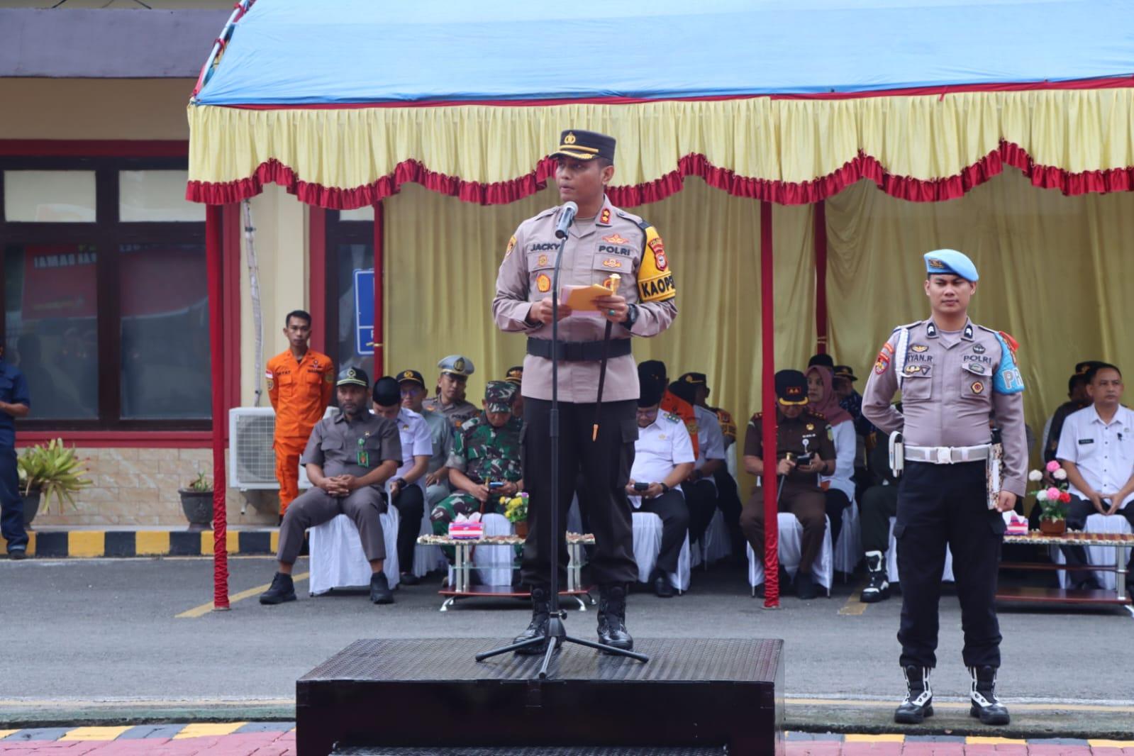 Kapolres Bantaeng AKBP Edward Jacky Tofani Umbu Kaledi SH, S.IK, MM memimpin apel dan diikuti personel TNI – Polri dan stakeholder terkait.