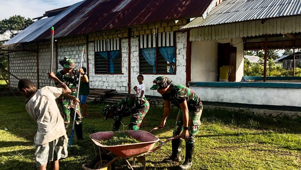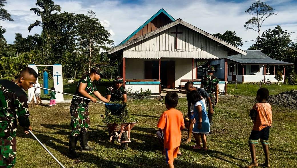 KABUPATEN KEEROM – Satuan Tugas Pengamanan Perbatasan RI-PNG Sektor Utara Yonif 122/TS, yang berada di bawah naungan Korem 172/PWY, Pos Pos Ujung Karang bersama masyarakat melaksanakan kegiatan karya bakti di Gereja GKI kp.Pikere Distrik Arso Timur Kab. Keerom, Prov Papua, Sabtu (23/09/2023).