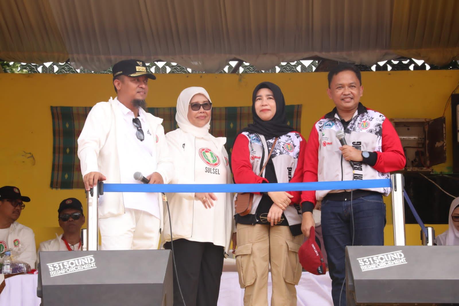 Turut mendampingi Bupati Bantaeng dalam pembukaan Porseni PGRI ke-VI Sulsel di Soppeng Ketua TP. PKK Bantaeng Hj. Sri Dewi Yanti.