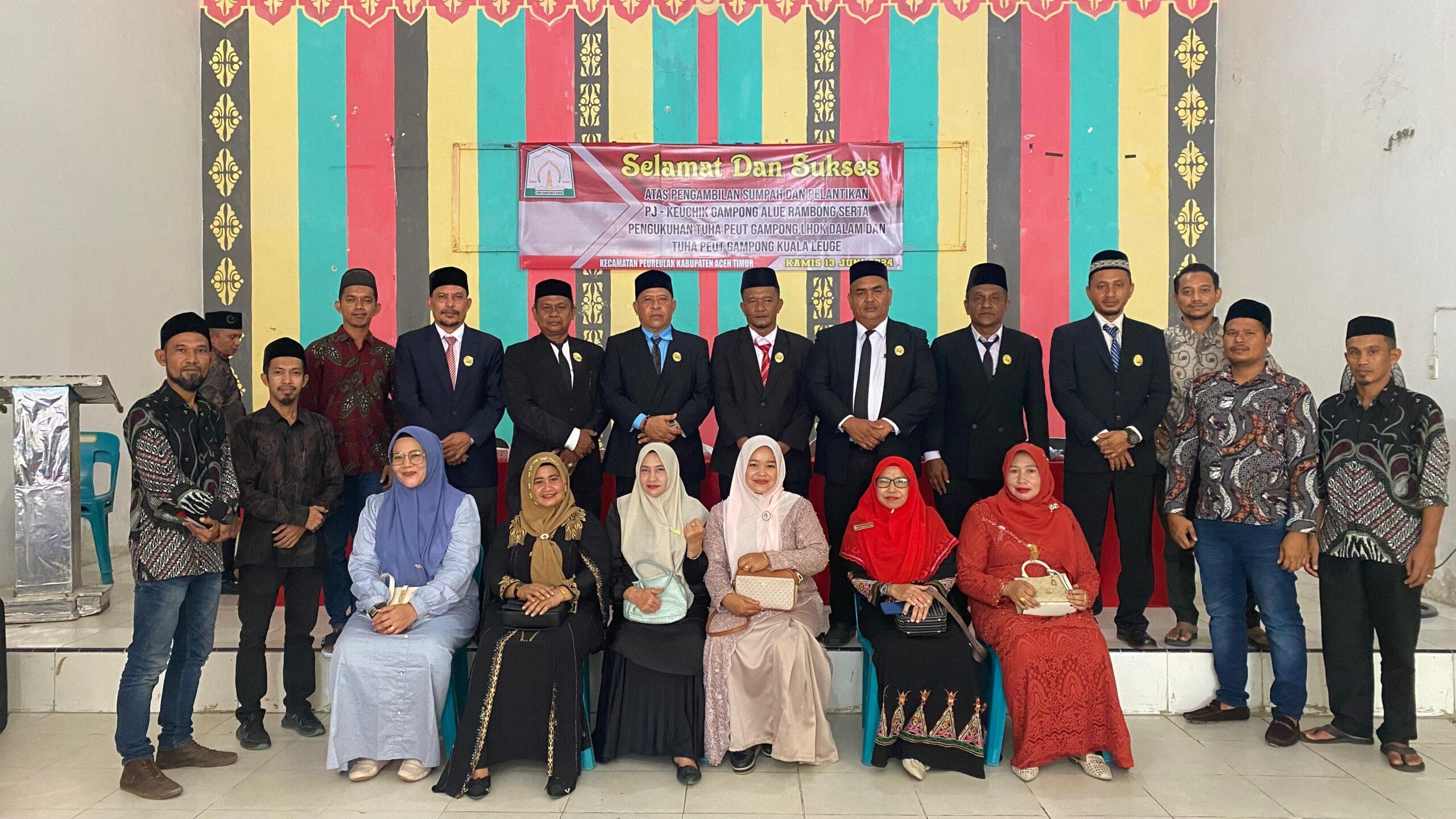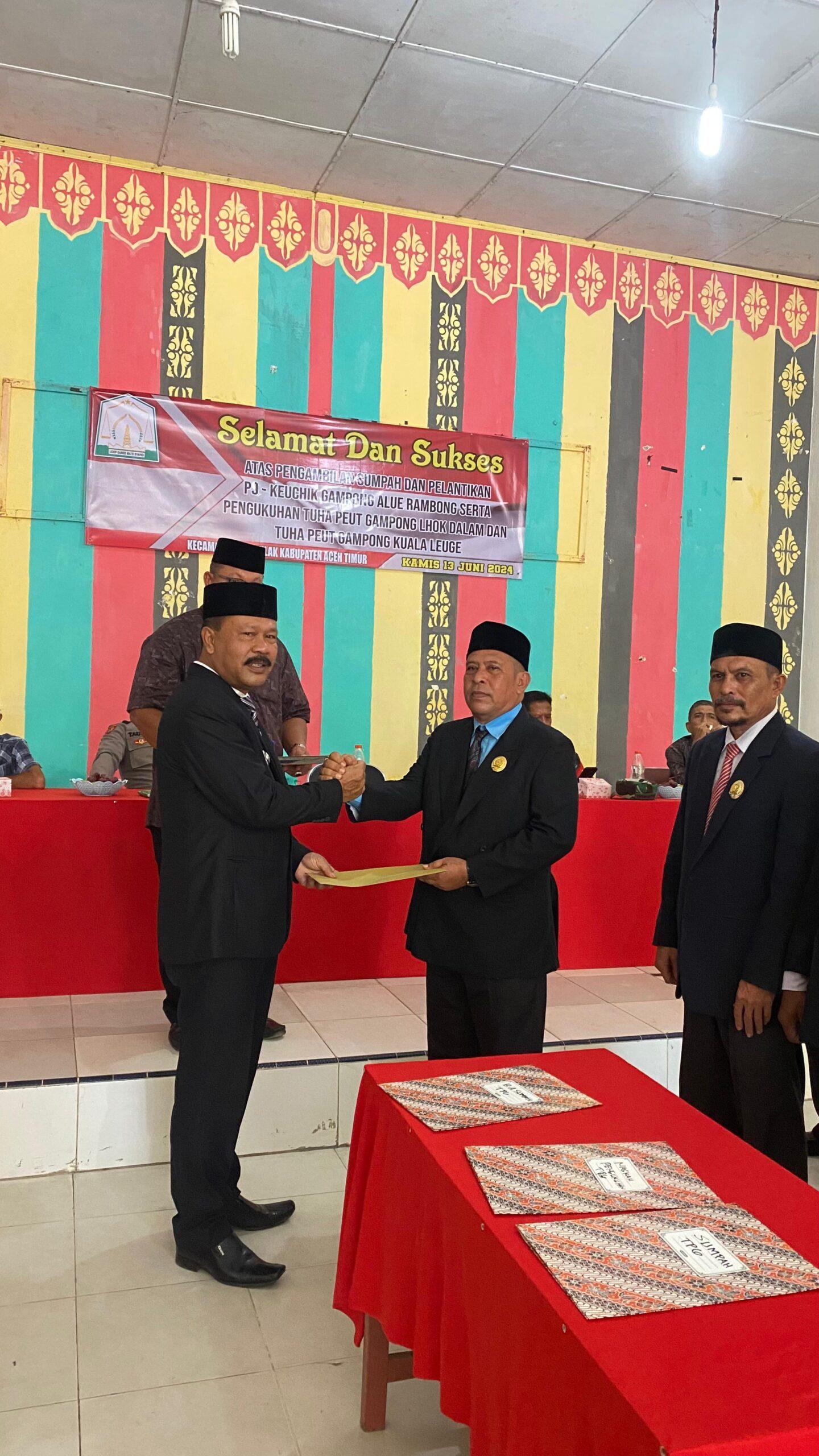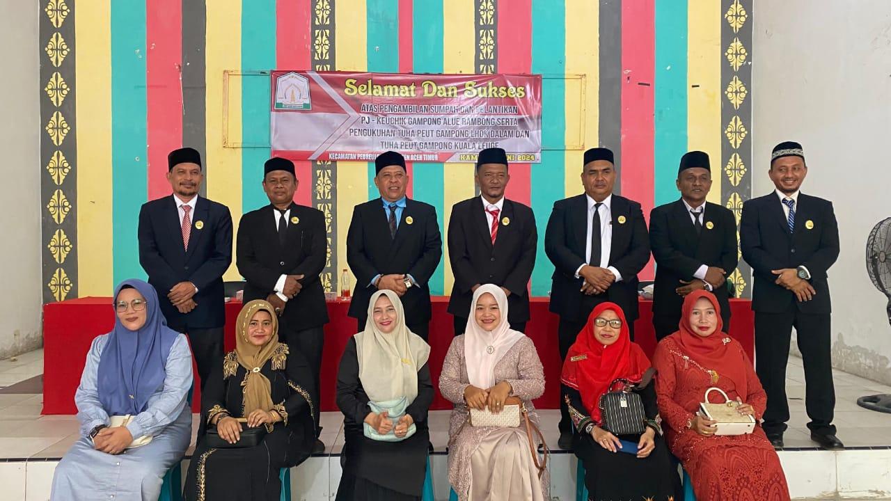 Pelantikan tersebut sesuai dengan Surat Keputusan Bupati Aceh Timur Nomor : 148.1/32/141/DPMG/G/PJ/2024 Tentang Pemberhentian Keuchik/pengangkatan Penjabat Keuchik Gampong Alue Rambong, Kecamatan Peureulak Kabupaten Aceh Timur dan Keputusan Bupati Aceh Timur, Nomor : 149/40/DPMG/2024 Tentang Pengangkatan Tuha Peut Gampong Lhok Dalam Kecamatan Peureulak, Kabupaten Aceh Timur Periode 2024– 2030 serta Keputusan Bupati Aceh Timur, Nomor : 149/47/DPMG/2024 Tentang Pengangkatan Tuha Peut Gampong Kuala Leuge Kecamatan Peureulak, Kabupaten Aceh Timur Periode 2024– 2030.