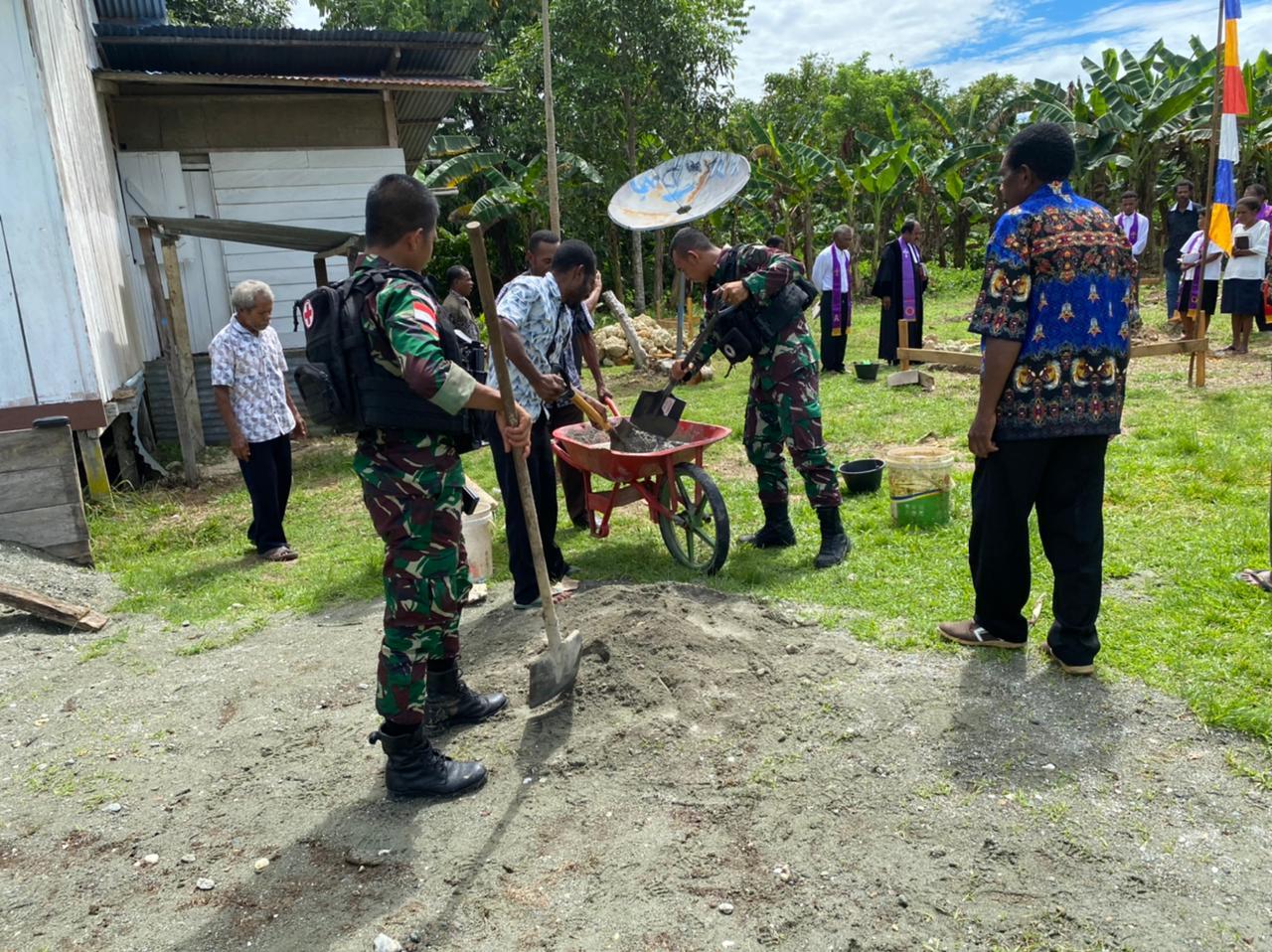 “Kegiatan gotong royong ini sebelumnya dilaksanakan ibadah bersama dengan Warga, diawali dari pembersihan lahan yang akan dibangun lalu dilanjutkan dengan acara peletakan batu pertama oleh Ketua Bapak Pendeta Ohodo,“ ucap Serda Aaron Gerald Umboh anggota Satgas Yonif 711/Rks.
