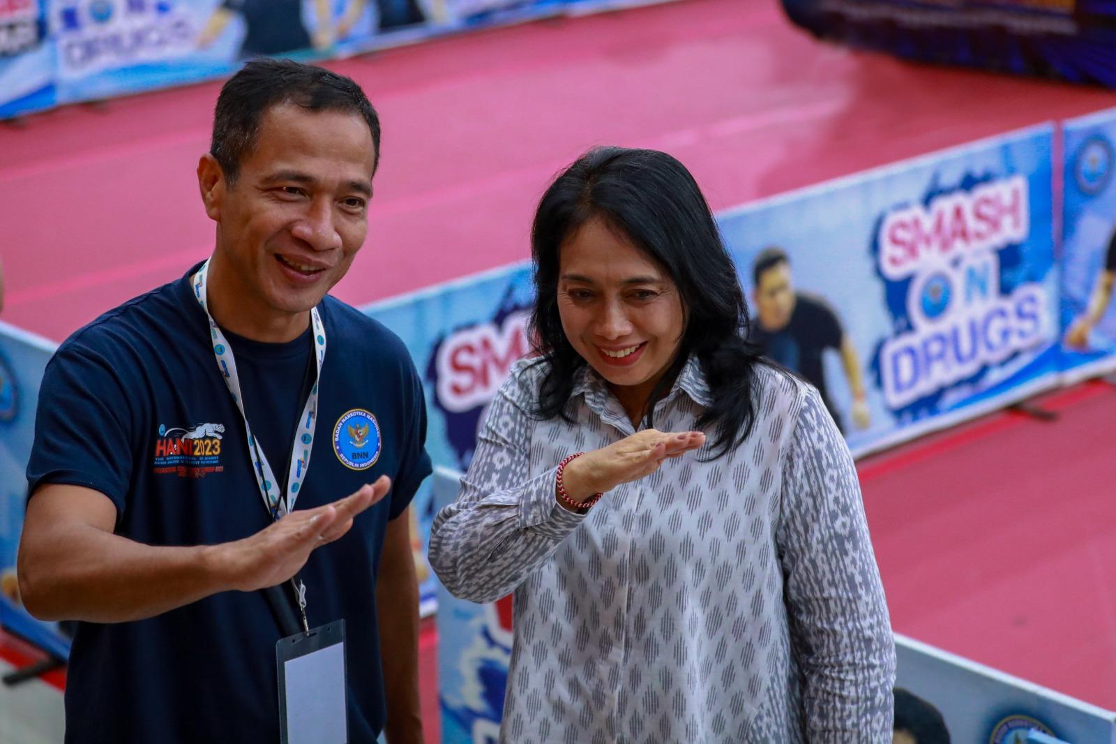 BALI – Menteri Pemberdayaan Perempuan dan Anak (PPPA), I Gusti Ayu Bintang Darmawati, S.E., M.Si., menghadiri gelaran Smash On Drugs (SOD) International Table Tennis Championship 2023 yang diselenggarakan oleh Badan Narkotika Nasional Republik Indonesia (BNN RI) di Auditorium Widya Sabha Universitas Udayana, Badung, Bali, pada Senin (19/6).