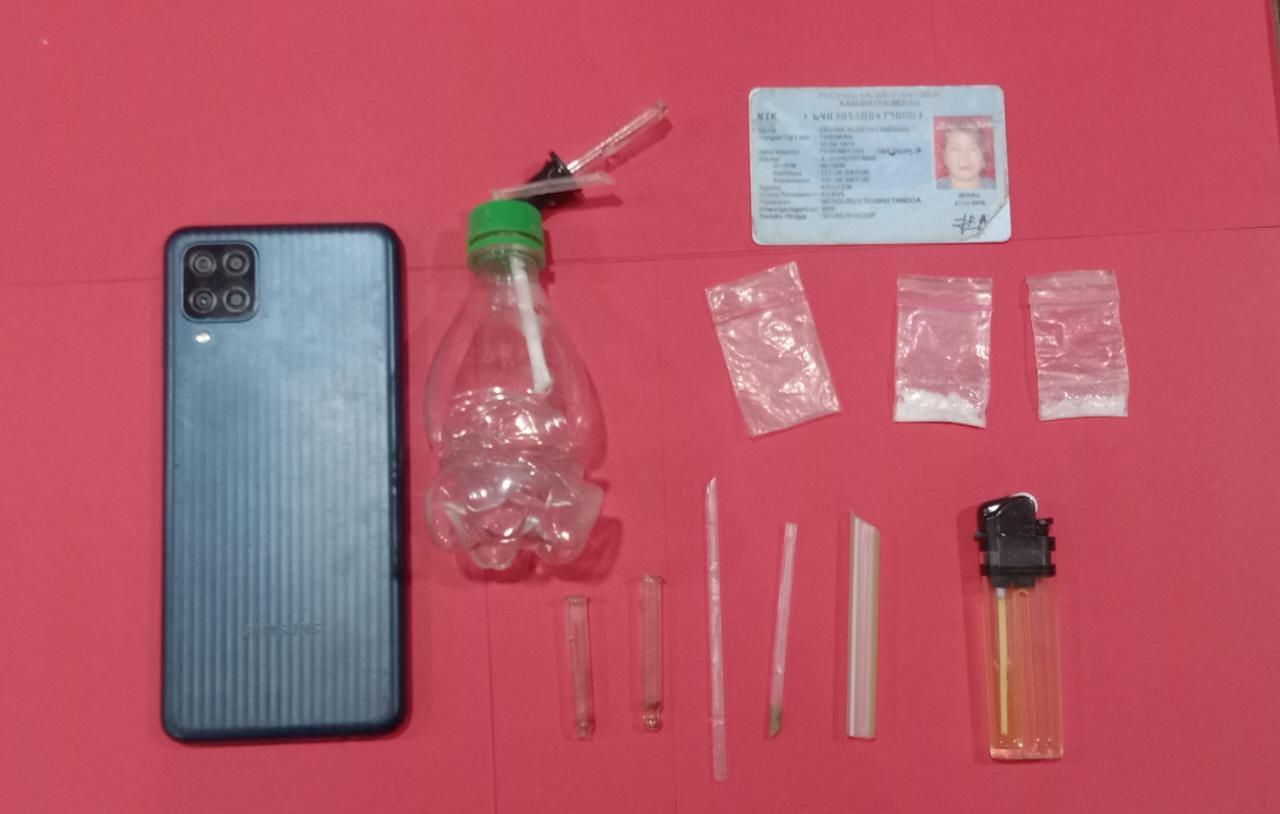Dalam penggeledahan, petugas berhasil menemukan dua poket kecil yang diduga berisi narkotika golongan I jenis shabu milik pelaku. Selain itu, barang bukti lainnya juga turut diamankan, antara lain satu buah plastik pembungkus bekas sabu, satu set alat bong sabu, satu buah korek gas, dua buah kaca fanbo, satu buah sedotan kecil, potongan sedotan, dan satu unit ponsel merk Samsung warna biru.