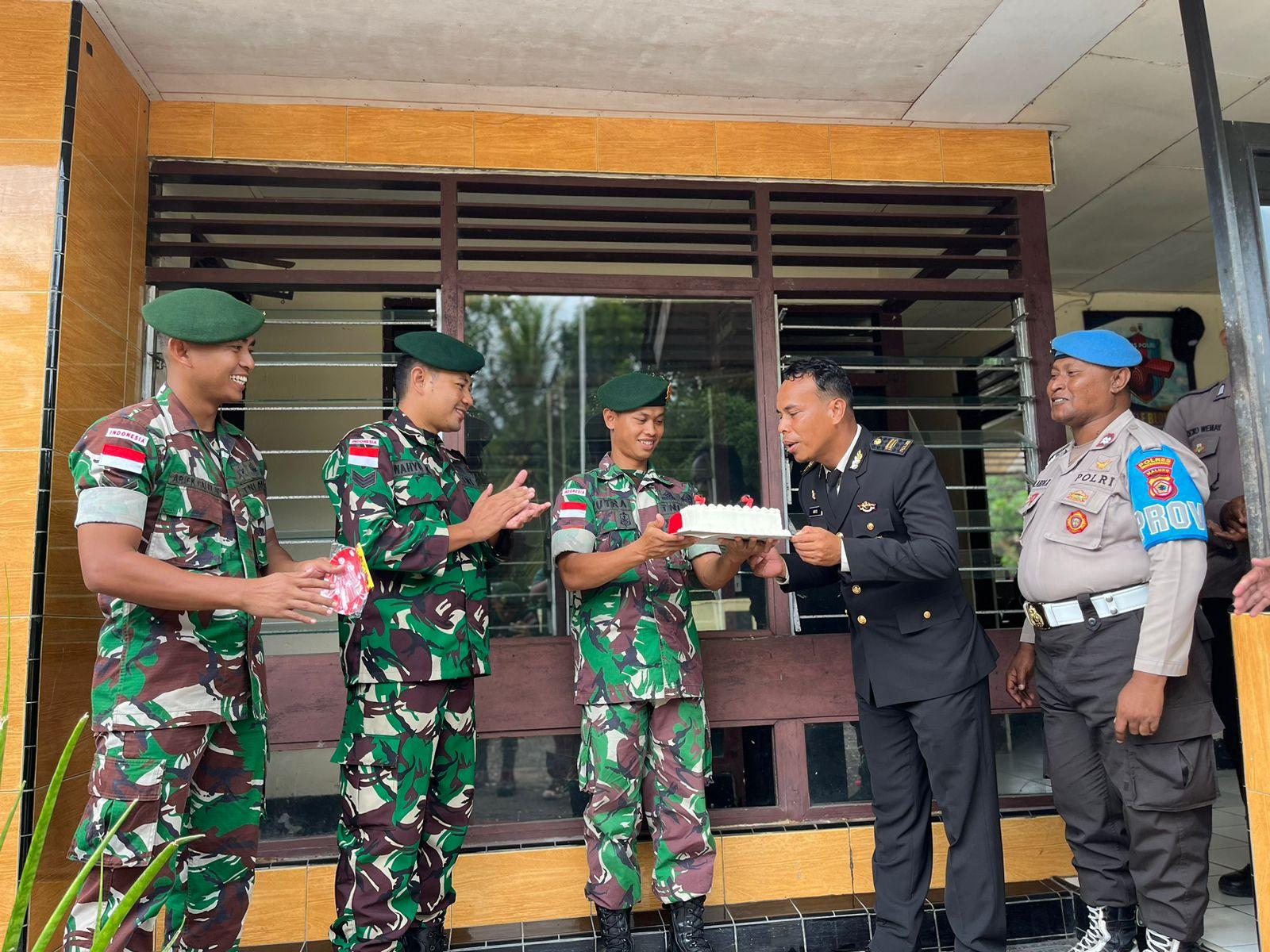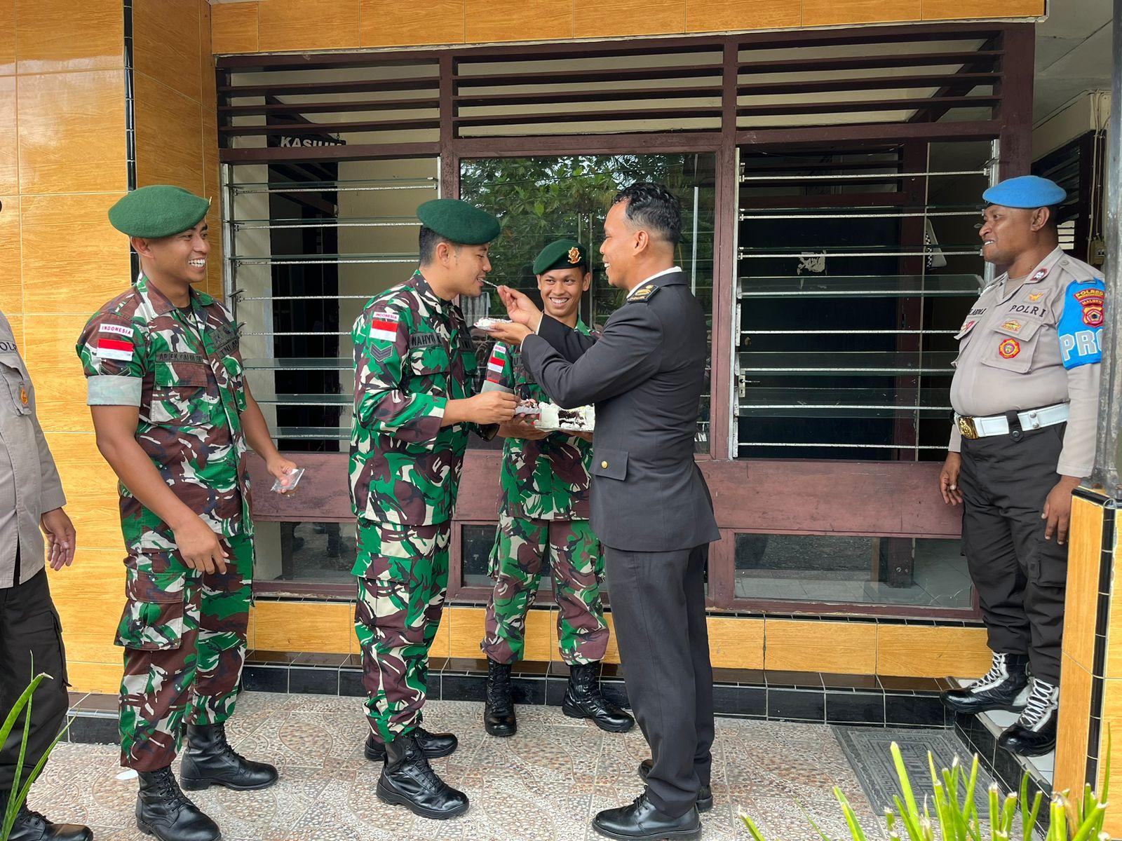 AMBON – Pos Kairatu yang tergabung dalam Satgas Pamrahwan Maluku Yonarmed 1 Kostrad memberikan kejutan kepada personel Polsek Kairatu dalam rangka memeriahkan dan merayakan peringatan HUT Ke-77 Bhayangkara tahun 2023.