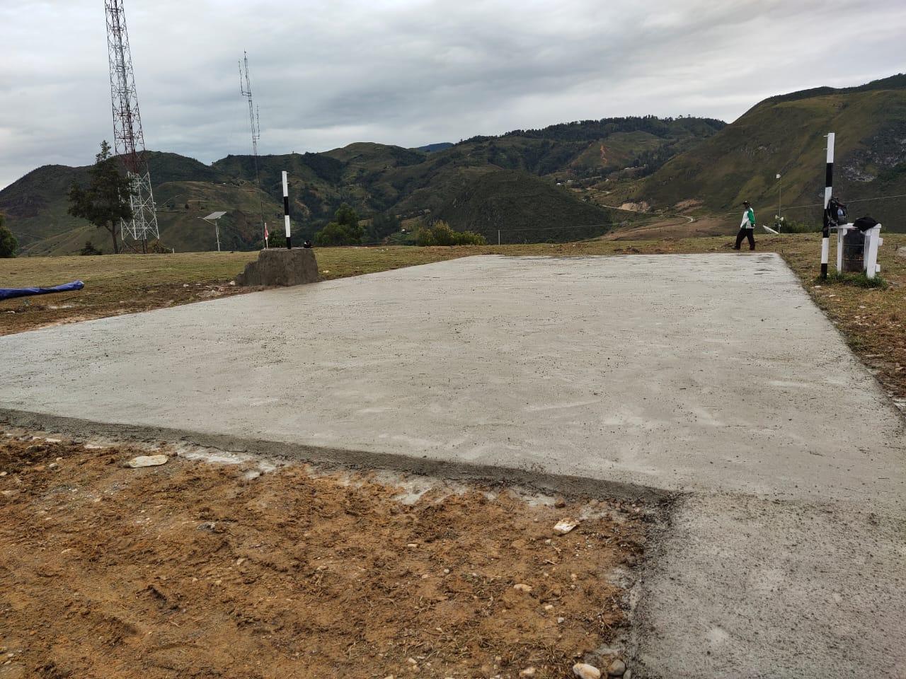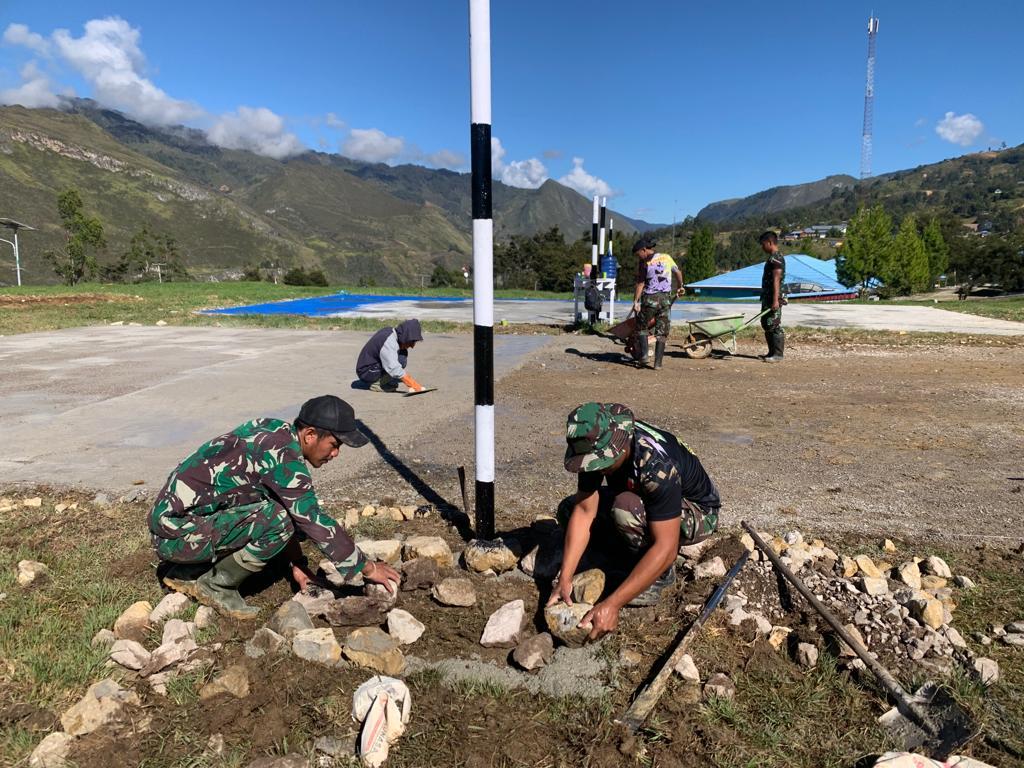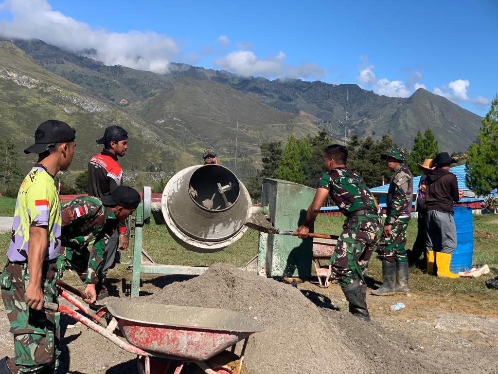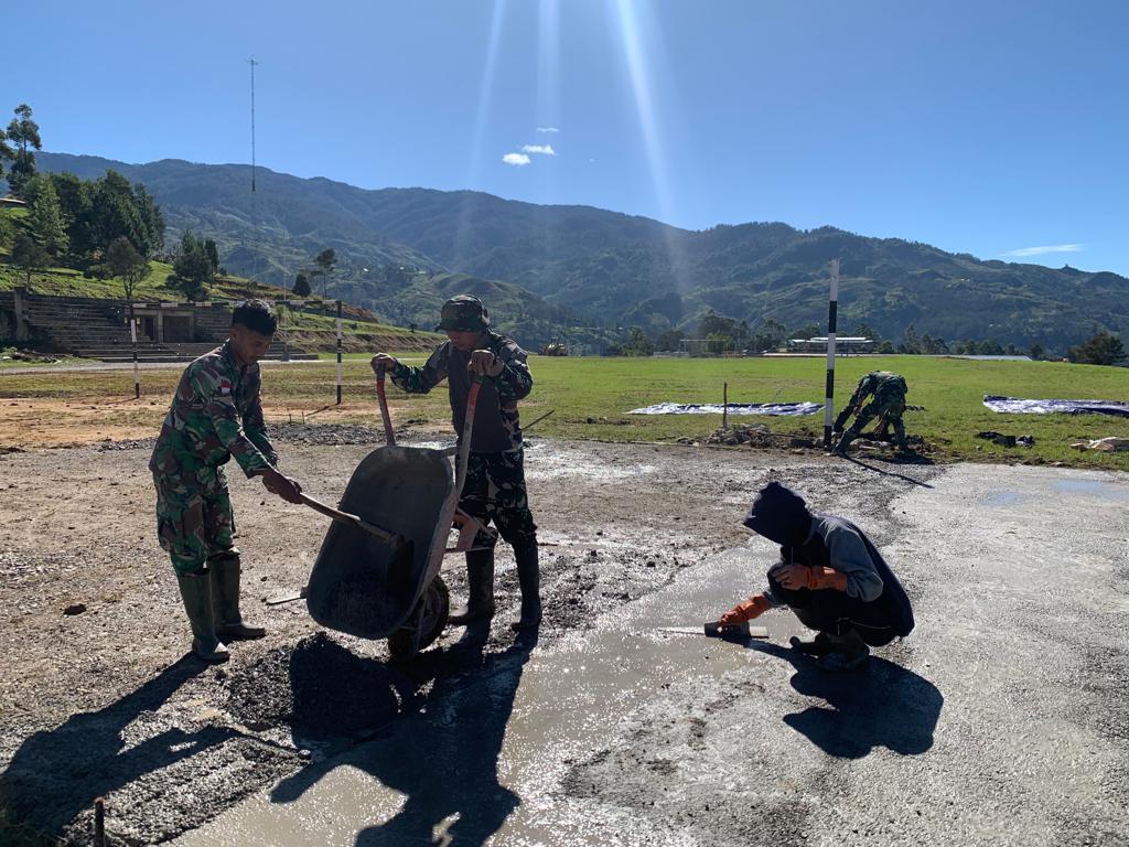 Satgas Yonif 721/Mks membangun lapangan volly permanen yang berada di Lapangan Ampera, Kab. Lanny Jaya, Papua Pegunungan, Sabtu (29/07/23).