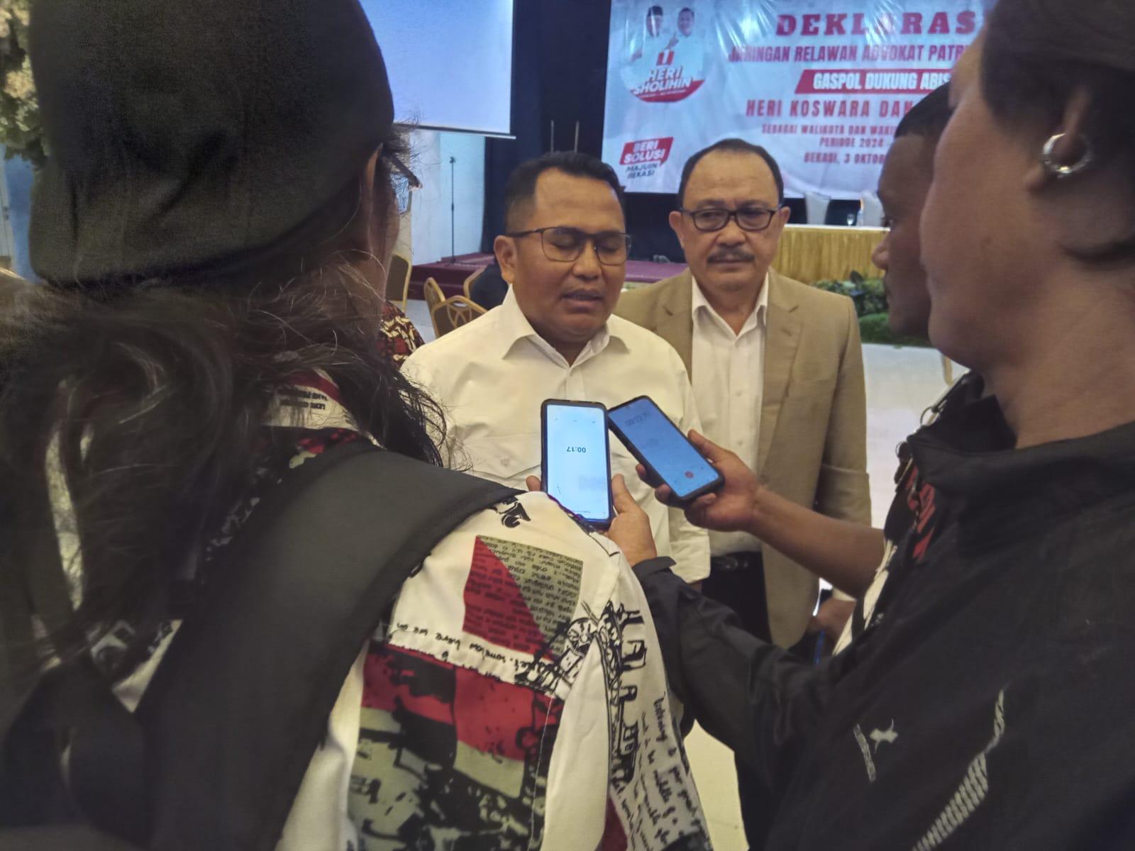 KOTA BEKASI – Jaringan Relawan Advokat Patriot Bekasi (JRAPB) menyatakan, dukungannya terhadap Calon Wali Kota dan Wakil Wali Kota Bekasi, pasangan nomor urut 1 Heri Koswara dan Sholihin yang dideklarasikan di Graha Wulansari Kota Bekasi dengan tema GASPOL DUKUNG ABIS! Heri Koswara dan Sholihin Selaku Wali Kota Bekasi dan Wakil Wali Kota Bekasi Priode 2024-2029, Kamis (03/10/24).