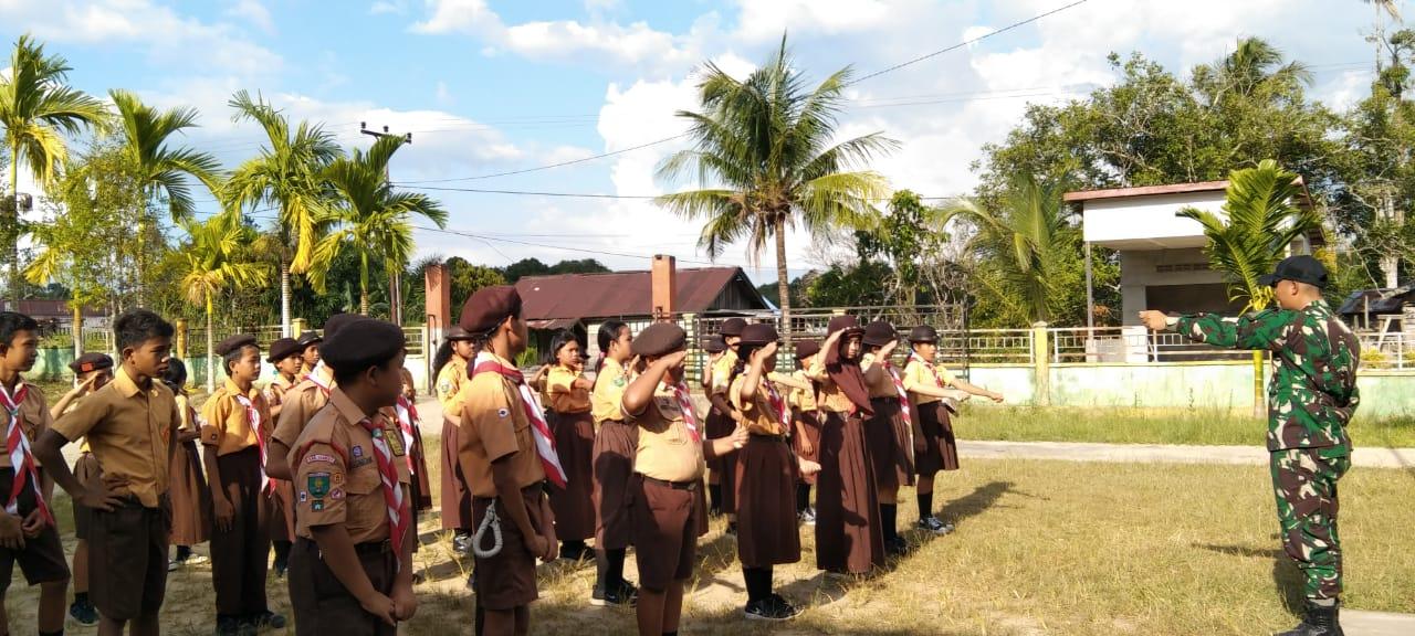 SAMBAS -Pos Koki Sajingan Terpadu Satgas Pamtas Yonarmed 16/TK Dpp Serda Aldi bersama dengan 1 orang anggota melaksanakan kegiatan Pelatihan PBB Pramuka kepada Siswa Siswi SDN 01 Aruk, Des. Sajingan Besar, Kec. Sajingan Besar, Kab. Sambas.