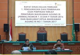 “Salah satunya adalah pengawasan dan pembinaan terkait Peraturan Mahkamah Agung (Perma) Nomor 7, 8, dan 9 Tahun 2016, Maklumat Ketua Mahkamah Agung RI No 1 Tahun 2017, serta Instruksi Direktur Jenderal Badan Peradilan Umum Mahkamah Agung Republik Indonesia,” ujarnya.