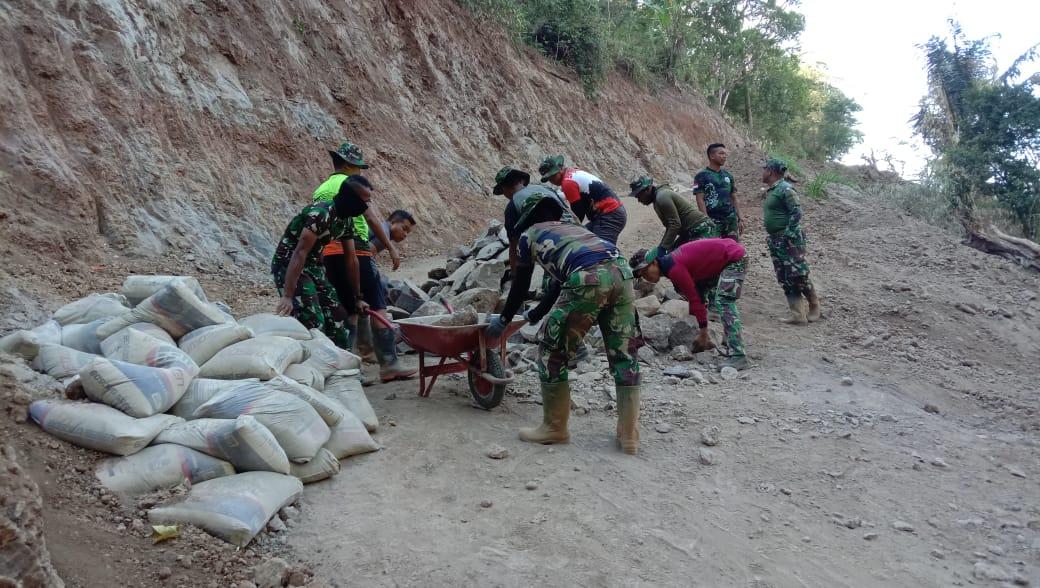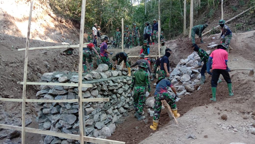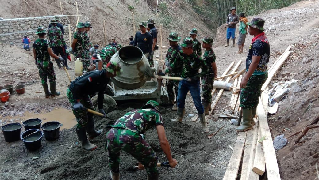 Kerjasama yang baik pun ditunjukkan oleh prajurit TNI dan warga yang tergabung dalam Satgas TMMD. Secara bahu membahu bersama warga melaksanakan gotong royong dalam pembangunan jembatan, dimulai dengan pembuatan pondasi bersama sama mengangkat campuran semen dan pasir.