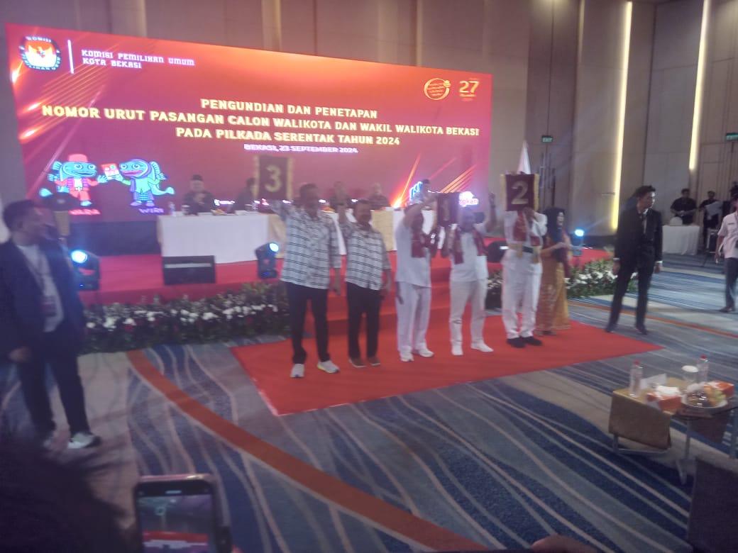 KOTA BEKASI – KPU (Komisi Pemilihan Umum) Kota Bekasi dalam menetapkan tiga Paslon mengadakan gelar pengambilan dan pengundian, nomor urut Pasangan Calon (Paslon) Walikota serta Wakil Walikota Bekasi. Acara ini dilaksanakan di Harris Convention Hall, Jl. Bulevar Bar. No. JA 001/0, Summarecon Bekasi, pada Senin (23/9/2024) mulai pukul 15.00 WIB.