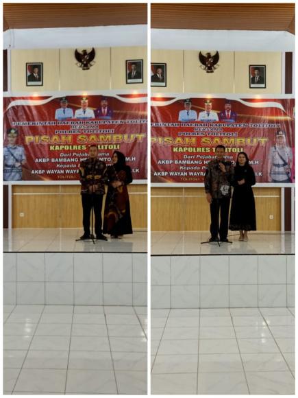 Bupati Tolitoli Hi.Amran H.Yahya didampingi Ketua DPRD Kabupaten Tolitoli. Ny.Hj.Sriyanti Dg.Parebba dalam sambutannya mengatakan Salam gotong royong untuk kita semua atas nama Pemerintah daerah Kabupaten tolitoli mengucapkan terima kasih kepada seluruh jajaran Polres Tolitoli dan semua pihak yang telah turut berpartisipasi untuk menyelenggarakan acara malam Pisah sambut dari pejabat lama kepada pejabat baru Kapolres Tolitoli.