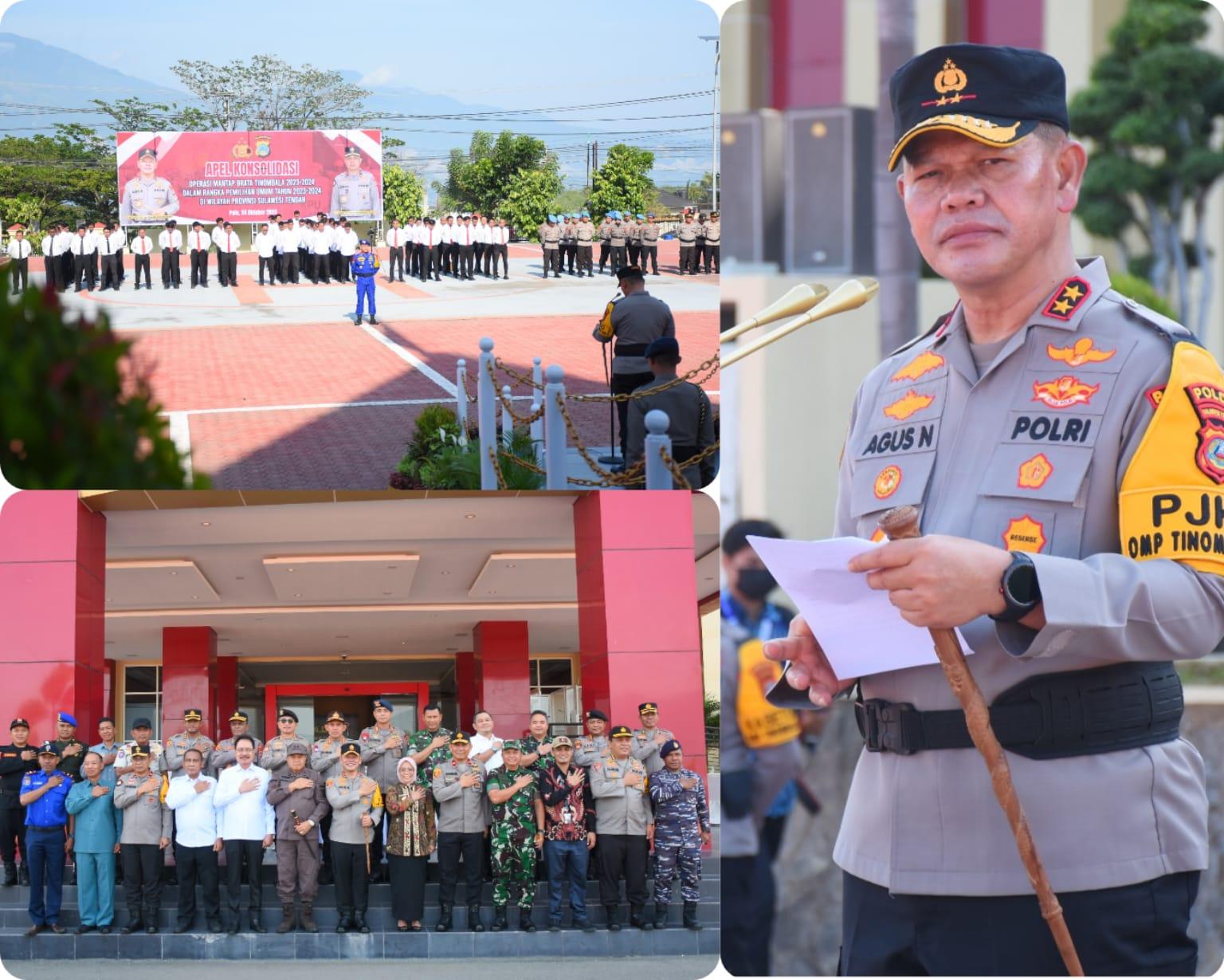 PALU – Kapolda Sulteng Irjen Pol Dr. Agus Nugroho, S.I.K., S.H., M.H., memimpin pelaksanaan Apel Konsolidasi Operasi Mantap Brata (OMB) Tinombala 2023-2024 dalam rangka pengamanan Pemilu 2024 di Provinsi Sulawesi Tengah (Sulteng), Kamis (24/10/2024).