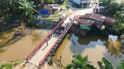 Jembatan Bailey tersebut menghubungkan perbatasan Desa Besilam Bukit Lembasa dengan Desa Banjaran Raya, Kecamatan Padang Tualang, sebagai akses vital masyarakat pascabencana untuk mendukung aktivitas sosial dan perekonomian warga.