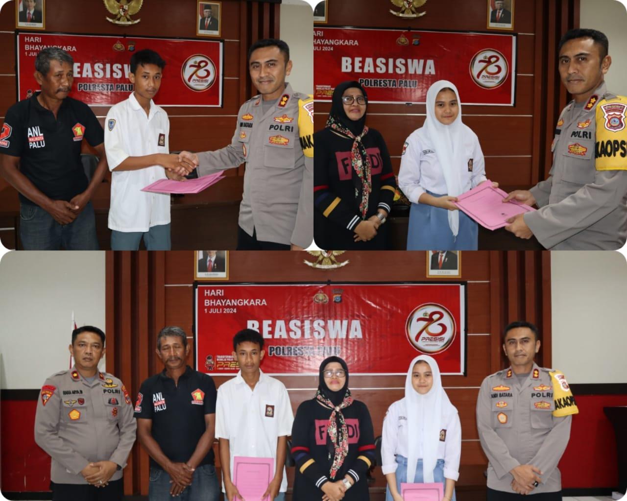 Beasiswa ini diserahkan langsung oleh Wakapolresta Palu, AKBP Andi Batara Purwacaraka, S.I.K., S.H., dan didampingi oleh Kabag SDM Polresta Palu, Kompol I Nyoman Raka Arya Wiyasa, S.H., dalam rangka menyambut Hari Bhayangkara ke-78.