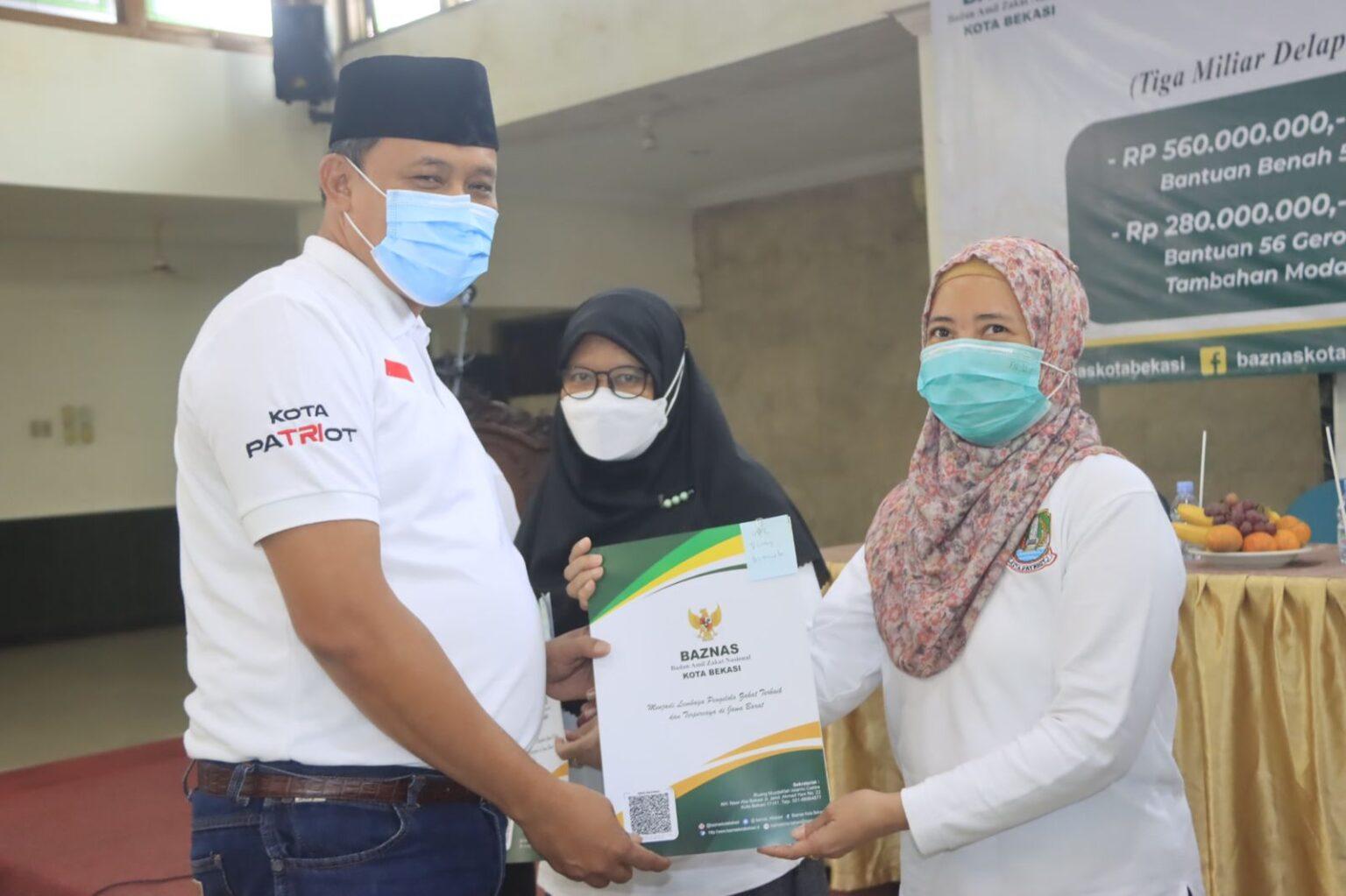 KOTA BEKASI – Badan Amil Zakat Nasional (Baznas) Koa Bekasi mendistribusikan bantuan dana zakat sebesar Rp 3.849.600.000 di Aula Masjid Al-Barkah. Pelaksana Tugas (Plt) Wali Kota Bekasi Tri Adhianto menyerahkan dana zakat secara simbolis bersama Ketua Baznas Kota Bekasi Ismail Hasyim, Ketua MUI Kota Bekasi Mir’an Syamsuri, dan Asisten Daerah II Kota Bekasi Sudarsono, Rabu (2/3/2022).
