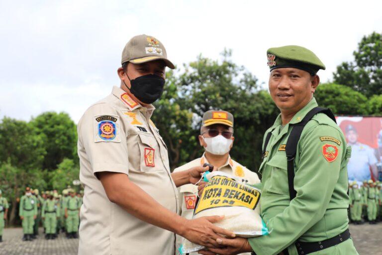Pelaksana Tugas (Plt.) Wali Kota Bekasi, Tri Adhianto didampingi oleh Kepala Satpol PP Kota Bekasi, Karto beserta jajaran mengikuti apel akbar tersebut dengan rangkaian pemberian beras sebanyak 10 kg kepada para Anggota linmas dari masing masing Kelurahan se Kota Bekasi.