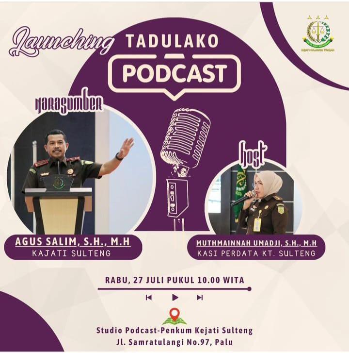 PALU – Kejaksaan Tinggi (kejati) Sulawesi Tengah melakukan terobosan penyiàran informasi terbaru yang diberi nama Podcast Tadulako Kejaksaan Tinggi Sulawesi Tengah.
