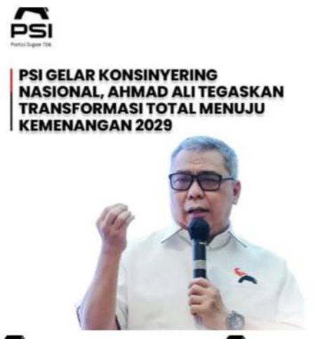 Konsinyering yang dilaksanakan Dewan Pimpinan Wilayah (DPW) PSI se-Indonesia pada Minggu, 12 April 2026, di Jakarta, juga menunjukkan keseriusan penuh partai dalam menyongsong Pemilu 2029. Menurut H. Ahmad Ali, forum ini menjadi momentum strategis untuk memperkuat era baru PSI sekaligus kepemimpinan transformasional.