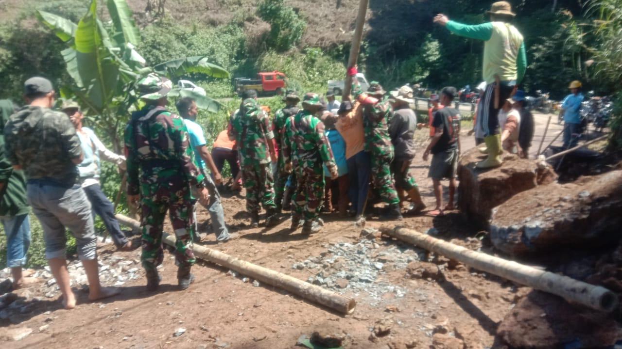 Puluhan orang terlibat dalam kegiatan karya Bakti baik dari unsur TNI, Polri, Staf Dinas Pekerjaan Umum (PU), perangkat desa dan masyarakat setempat.