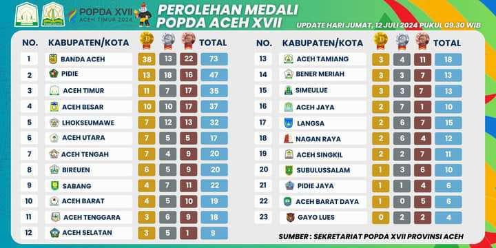 Dia menyebutkan, lima besar perolehan medali hari keenam pelaksanaan POPDA yaitu Banda Aceh diurutan pertama, Pidie di posisi kedua, Aceh Timur berhasil naik ke peringkat ketiga dan Kota Lhokseumawe di urutan keempat serta Aceh Besar di posisi kelima.